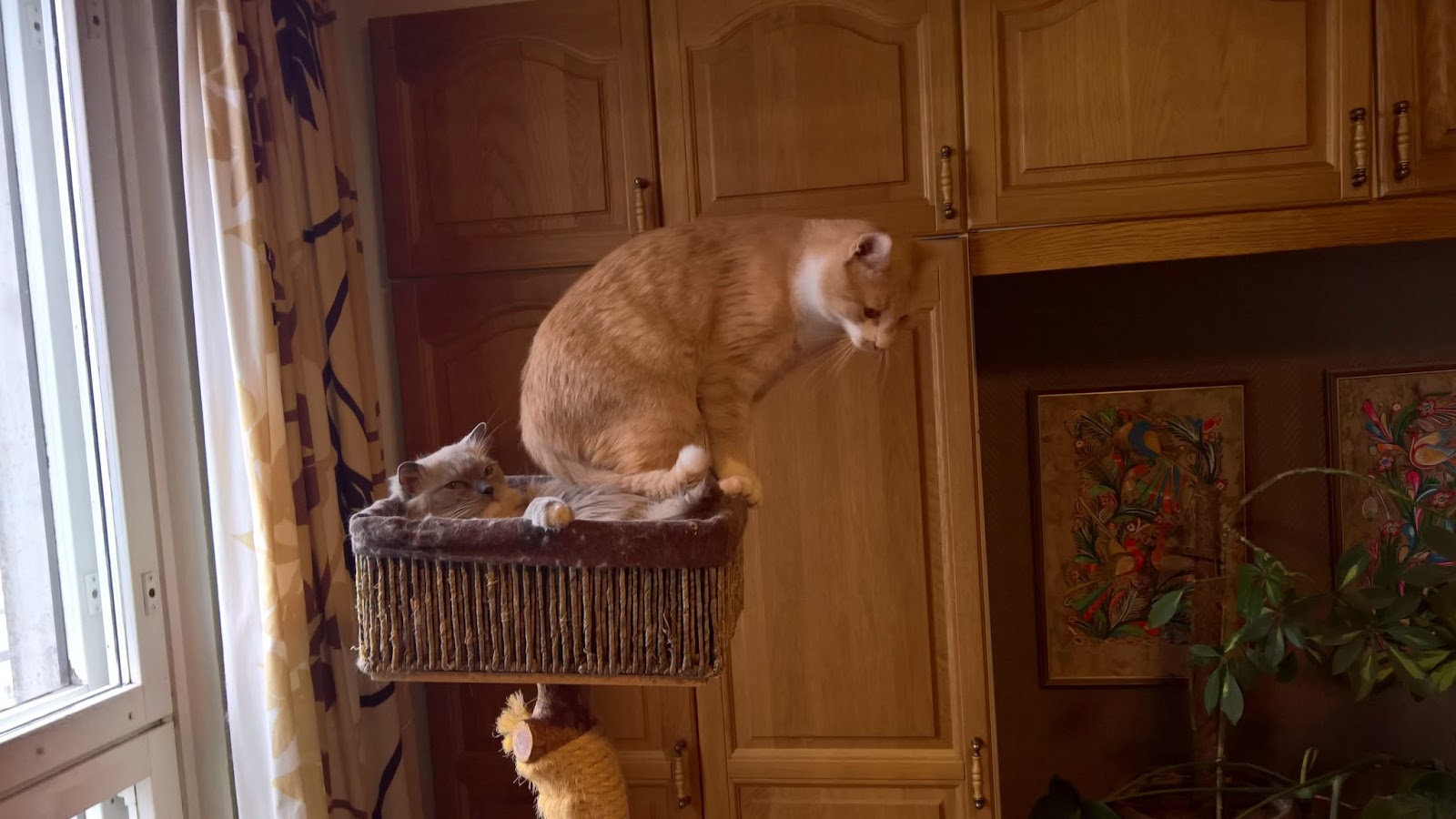 | Unskilla ja Svantella on joskus erimielisyyksiä siitä, montako kissaa mahtuu kiipeilypuun koriin. |
