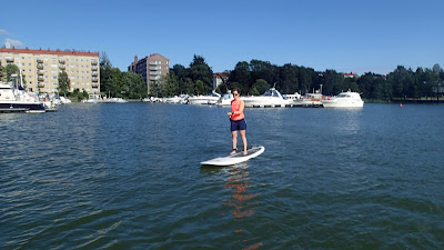 Suppailu oli ihan hauskaa ja kovaa meloessa tuli jopa hiki. Eniten hommassa väsyivät jalkapohjat, kun niiden lihaksia joutui käyttämään koko ajan tasapainoiluun. Voisin lähteä joskus aurinkoisena päivänä uudelleenkin ja suppailla vaikka Seurasaaren ympäri. Homma voisi olla ihan kivaa palauttelujumppaa sitten SM-rogan jälkeen.